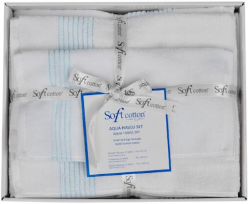 SOFT COTTON AQUA törölközők és fürdőlepedők ajándékszettje, 5 db Fehér - Türkiz színű hímzés / Turquoise Szett (2 db 33 x 33 cm-es, 2 db 45x90 cm-es törölköző, 75 x 150 cm-es fürdőlepedő)